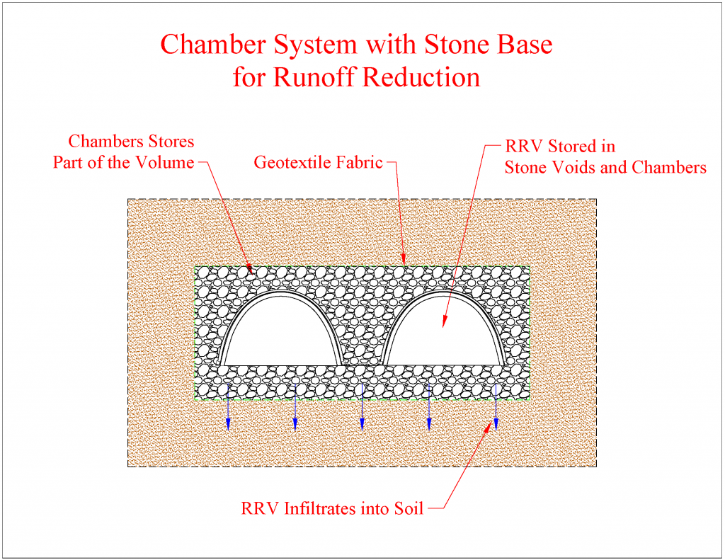 The typical RRV system is a modified detention system, either an above ground detention pond with an unrouted volume designed to infiltrate or an underground detention system with a stone aggregate base. The RRV seeps into the stone voids and then into the soil below the system.